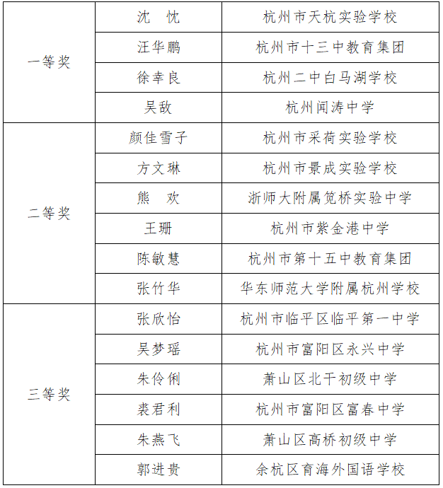在各區(qū)、縣(市)教育部門和直屬學(xué)校推薦的基礎(chǔ)上,經(jīng)組織參賽材料評審以及面試、決賽等,最終評出小學(xué)組、初中組、高中組一、二、三等獎共64名,其中,小學(xué)組一等獎5名、二等獎5名、三等獎6名,初中組一等獎4名、二等獎6名、三等獎6名,普高組一等獎4名、二等獎5名、三等獎8名,職高組一等獎2名、二等獎4名、三等獎9名。
