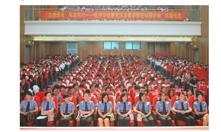 《杭州超限教育中心瑪林2015年5月26日訊》5月22日下午,學(xué)軍高一學(xué)子齊聚國(guó)際交流中心,近600名同學(xué)用心在感受“關(guān)愛(ài)成長(zhǎng)、與法同行”的聲音;顒(dòng)邀請(qǐng)了學(xué)軍中學(xué)校長(zhǎng)陳立群,杭州市人民檢察院副檢察長(zhǎng)葉玉秋,市委教育工委副書(shū)記兼教育局副局長(zhǎng)金波,市普法辦副主任王正航等領(lǐng)導(dǎo)出席。陳校長(zhǎng)激情澎湃的發(fā)言帶動(dòng)了大家的積極性,葉玉秋女士和金波局長(zhǎng)的發(fā)言讓我們了解到這次講座的意義,讓學(xué)軍學(xué)子投入到這場(chǎng)有意義的講座當(dāng)中。嘉賓們?yōu)楹贾菔袡z察官法治宣講團(tuán)成員頒發(fā)聘書(shū),向?qū)W軍中學(xué)學(xué)生代表贈(zèng)送宣傳資料。