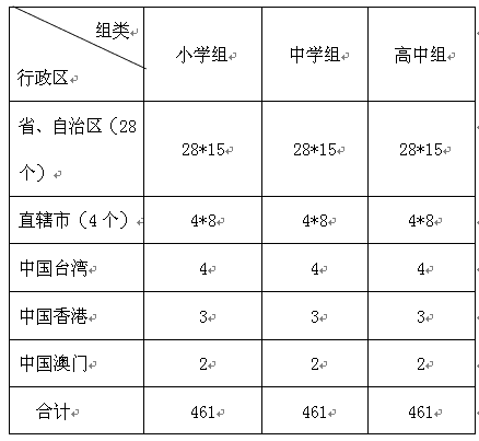2、在每個組中,全國每個省 、自治區(qū)均為15個名額:全國每個直轄市均為8個名額,中國TAIWAN為4個、中國HONGKONG為3個、中國MACAO 2個。具體分布詳見下表: