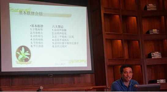 他首先從理論入手,結(jié)合理論講解進(jìn)行了正格、非正格經(jīng)典聯(lián)例剖析,再以他的《飲和集》收集的楹聯(lián)為例,組織學(xué)員進(jìn)行現(xiàn)場(chǎng)消化。學(xué)員們普遍感到深入淺出,通俗易懂。