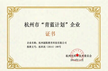 《杭州超限教育中心2014年11月11日訊》近日,杭州超限教育中心(杭州超限教育科技有限公司)被杭州市科學技術委員會授予杭州市“青藍計劃”企業(yè)榮譽稱號。