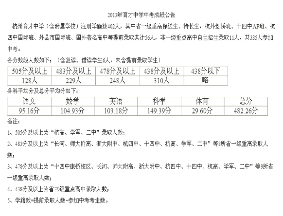 《杭州超限教育中心李林2015年11月04日訊》杭州育才中學歷年都以優(yōu)秀的學生成績回饋廣大家長的信任寄托。不僅 03、04、05、06四年連續(xù)中考重高上線率的第一名,成為杭城第一所連續(xù)四年整體發(fā)揮最為出色的學校。以后繼續(xù)保持這種教學和成績優(yōu)勢,現(xiàn)截取育才中學2013年中考成績分布情況,分享如下: