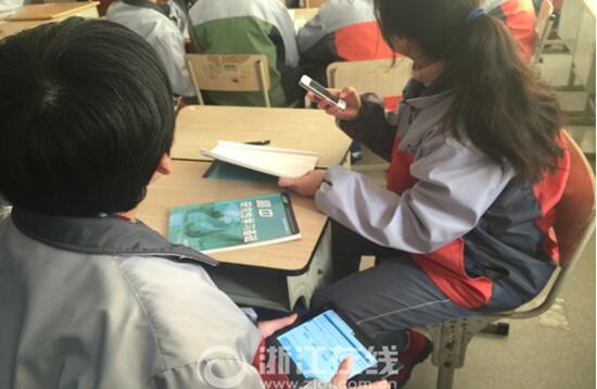 高中校園里能帶手機(jī)嗎?當(dāng)在場(chǎng)的眾多媒體記者疑惑時(shí),申屠永慶校長(zhǎng)說(shuō),手機(jī)是學(xué)生的“第二課堂”。為什么能這么說(shuō)呢?原來(lái),校園里提供WIFI,還給學(xué)生提供了“學(xué)習(xí)元”APP。就像前來(lái)采風(fēng)的記者們還沒走進(jìn)校門,就已經(jīng)收到了學(xué)校細(xì)心準(zhǔn)備的小紙條——寫有校園WIFI和密碼的紙條!懊恐埽加醒芯啃蛯W(xué)習(xí)課程,課堂上就是使用手機(jī)APP來(lái)教學(xué)和互動(dòng)的!
