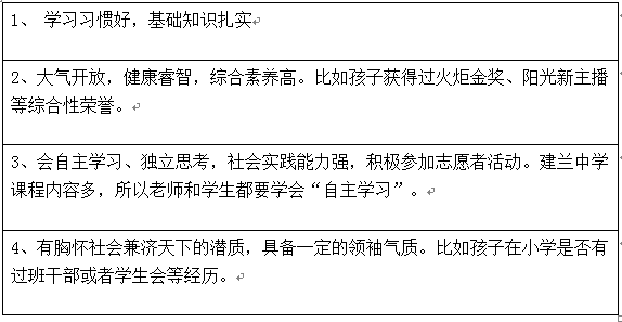 《杭州超限教育中心李林2015年12月31日訊》建蘭中學(xué)一直隸屬于杭州一流初中名校,培養(yǎng)了一代代優(yōu)秀學(xué)子成長(zhǎng)成才。但對(duì)于建蘭中學(xué)招生上,你知道什么樣的孩子比較受到學(xué)校的喜歡?帶著這個(gè)問(wèn)題,我教育機(jī)構(gòu)根據(jù)歷年的輔導(dǎo)經(jīng)驗(yàn)和校方的官方回答,詳細(xì)介紹如下:
