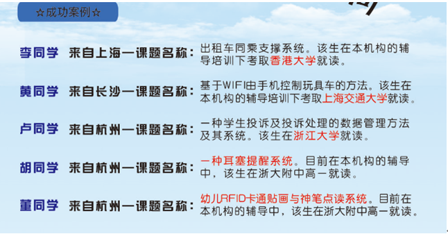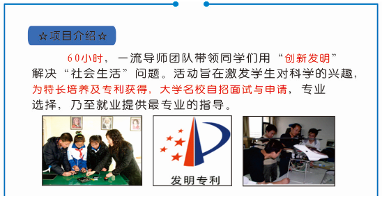 《杭州超限教育中心李林2016年3月08日訊》根據(jù)國務(wù)院《關(guān)于深化考試招生制度改革的實施意見》國發(fā)〔2014〕35號高考招生文件精神,提倡我國重點大學(xué)進(jìn)行自主招生,主要選拔具有學(xué)科特長和創(chuàng)新潛質(zhì)的優(yōu)秀學(xué)生。此項政策的推出為一些具有創(chuàng)新發(fā)明專利的特長學(xué)生,開辟了一條獨特的高考升學(xué)通道。據(jù)我國重點大學(xué)自主招生簡章公示,對于具有創(chuàng)新潛質(zhì)的中學(xué)生,在招生錄取上給予在學(xué)校錄取線基礎(chǔ)上3-60分的加分鼓勵,讓學(xué)子們實現(xiàn)名校夢想!同樣作為出國留學(xué)的必備能力—創(chuàng)新發(fā)明實踐活動能力,也是學(xué)子們通向世界名校的必備素質(zhì)。本教育機構(gòu)專門成立了“發(fā)明”直通高考名校研究所,并開展此次《發(fā)明直通高考名校—確保拿到重點高校自主招生入場券》培訓(xùn)項目,能夠讓學(xué)生的創(chuàng)造發(fā)明能力迅速提升,給予全程指導(dǎo),直至拿到專利證書,給予自主招生面試專業(yè)指導(dǎo),讓優(yōu)等中學(xué)生順利實現(xiàn)名校夢想!詳細(xì)內(nèi)容如下: