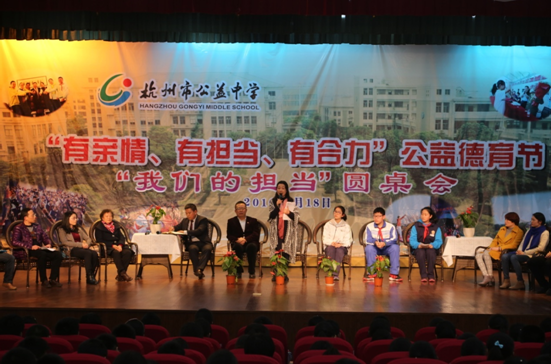 3月18日下午,本屆德育節(jié)的壓軸大戲 “我們的擔當”四方會談圓桌會議在大禮堂唱響,杭師大德育學博士研究生導師趙志毅教授、我校家長代表、學生代表和老師代表和全校師生共同參與,特邀杭州少兒頻道的主持人華芳擔當主持。