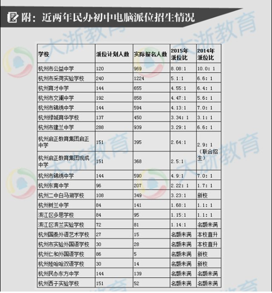《杭州超限教育中心李林2016年04月07日訊》再過(guò)一段時(shí)間,就會(huì)迎來(lái)杭州民辦初中電腦搖號(hào)的時(shí)候,所以很多家長(zhǎng)也會(huì)略顯得焦慮,F(xiàn)把往年杭州各個(gè)學(xué)校派位與錄取情況如下圖: