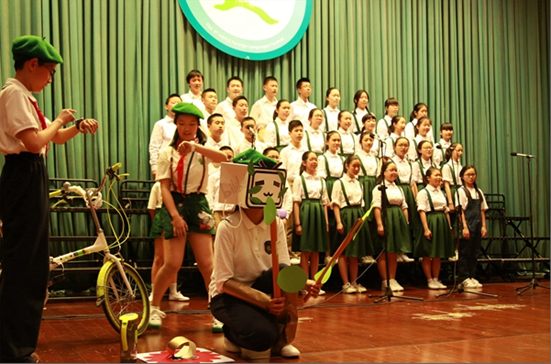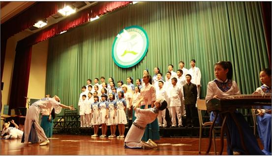 其中,初一2班的Drag me down以多樣的形式很好地將其呈現(xiàn)了出來,武術(shù)、街舞、古箏輪番上場(chǎng),讓人耳目一新,嘆為觀止。還有,初一4班一曲《青花瓷》讓大家通過一個(gè)小劇場(chǎng)緩緩走入青花瓷的意境中。白衣飄飄、步履款款,濃郁的中國氣息隨著優(yōu)美的歌聲體現(xiàn)得淋漓盡致。