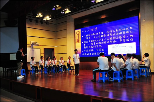 姑娘小伙頂梁柱,年輕教師不甘落后,李偉老師自去年承擔起“魔法戲劇社”后,便一發(fā)不可收拾,將戲劇表演和朗誦融入課程,帶領著學生們在人生的舞臺上尋找屬于自己的那一道光。