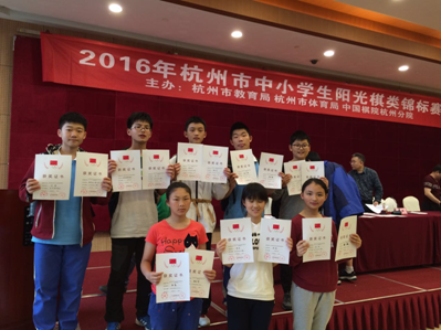 相較于往年,今年初中棋類比賽參賽選手驟增,賽場上高手如云,各學(xué)校的各位棋手都表現(xiàn)出了優(yōu)秀的旗手風(fēng)格,體現(xiàn)了杭州各學(xué)校棋手的優(yōu)秀素質(zhì)。但諸多優(yōu)秀的棋手對我校棋手來說既是壓力也是挑戰(zhàn),最終經(jīng)過兩日,共七輪的比拼,我校各位棋手頂住了壓力,中國象棋有四位同學(xué)進(jìn)入前八,圍棋有一位同學(xué)進(jìn)入前八,同時(shí),中國象棋和圍棋都獲得了團(tuán)體第一的好成績。