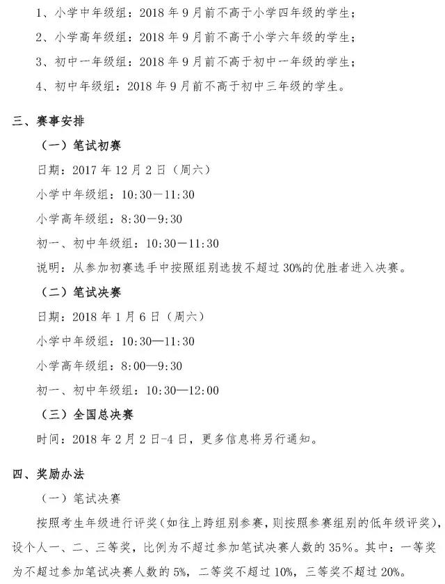2018年數(shù)學花園探秘(迎春杯)科普活動由數(shù)學花園探秘(迎春杯)科普活動全國組委會和北京資優(yōu)教育科技中心聯(lián)合主辦、浙江省應用數(shù)學研究會承辦,堅持活動題目普及性、趣味性、新穎性相結(jié)合的命題原則,為全國廣大優(yōu)秀學生提供相互交流和學習的平臺。 一、浙江承辦及媒體支持 浙江承辦:浙江省應用數(shù)學研究會 官方媒體:“杭州資優(yōu)生”微信公眾平臺 二、參賽辦法 按照參賽選手所在年級設(shè)立以下四個組別: 1、小中組:2018年9月前不高于小學四年級的學生; 2、小高組:2018年9月前不高于小學六年級的學生; 3、初一組:2018年9月前不高于初中一年級的學生; 4、初中組:2018年9月前不高于初中三年級的學生。 說明:杭州地區(qū)按照年級組織評獎,如往上跨組別參賽,則按照組別的低年級評獎(即按組別出卷、按年級評獎)。 三、賽事安排 。ㄒ唬┕P試初賽 日期:2017年12月2日(周六) 小學中年級組:10:30-11:30 小學高年級組:8:30-9:30 初一、初中年級組:10:30-11:30 說明:從參加初賽選手中按照組別選拔不超過30%的優(yōu)勝者進入決賽。 。ǘ┕P試決賽 日期:2018年1月6日(周六) 小學中年級組:10:30—11:30 小學高年級組:8:00—9:30 初一、初中年級組:10:30—12:00 (三)全國總決賽 時間:2018年2月2日-4日,更多信息將另行通知。 四、獎勵辦法 。ㄒ唬┕P試決賽 按照考生年級進行評獎(如往上跨組別參賽,則按照參賽組別的低年級評獎),設(shè)個人一、二、三等獎,比例為不超過參加筆試決賽人數(shù)的35%。其中:一等獎為不超過參加筆試決賽人數(shù)的5%,二等獎不超過10%,三等獎不超過20%。 。ǘ┤珖倹Q賽 具體評獎細則待全國組委會發(fā)布后,將在官網(wǎng)(ycb.zhuoedu.com)公布。 五、報名辦法 。ㄒ唬﹫竺麜r間:2017年7月24日-9月30日 。ǘ﹫竺麠l件:杭州地區(qū)的小學數(shù)學愛好者(3年級-8年級)均可本著自愿的原則參加本屆活動 。ㄈ┵愂陆(jīng)費: 初賽賽務費為100元/考生(含場地、考卷、考務、評審等); 決賽賽務費為100元/考生(含場地、考卷、考務、評審、證書等)。 。ㄋ模﹫竺绦颍阂韵路桨付x一即可 1、微信報名 由“杭州資優(yōu)生”微信公眾平臺提供線上報名通道;由考生自主選擇后續(xù)服務中心。 2、線下報名 線下報名:進入網(wǎng)站(ycb.zhuoedu.com)查看官方認證指定報名點,由報名點提供現(xiàn)場報名及后續(xù)服務。 六、材料征訂 為方便考生高效備考各大杯賽,特推薦選手征訂《數(shù)學杯賽一本通(內(nèi)部資料版)》,該資料結(jié)合各大全國性杯賽(“華杯賽”、“迎春杯”、“走美杯”、“希望杯”等)的命題特點,分年級匯編,工本費25元/冊,可在報名時自愿征訂,11月1日起至報名服務中心領(lǐng)取。 七、投訴與監(jiān)督 監(jiān)督郵箱:service@zhuoedu.com 杭州官網(wǎng):ycb.zhuoedu.com